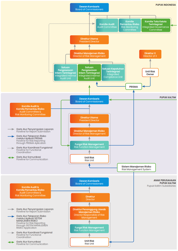 Struktur tata kelola di Pupuk Kaltim dibangun dalam tiga tingkatan yang terintegrasi, memastikan keselarasan dari level strategis hingga operasional. Pada tingkat Dewan Komisaris bersama Komite Pemantau Risiko menjalankan fungsi pengawasan untuk memastikan kebijakan strategis dijalankan dengan prinsip kehati-hatian. Di tingkat selanjutnya, Direksi yang diwakili Direksi Manajemen Risiko bertanggung jawab penuh atas implementasi manajemen risiko. Di garda terdepan, di setiap lini bisnis bertugas mengidentifikasi, menganalisis, dan memitigasi risiko sehari-hari secara proaktif.