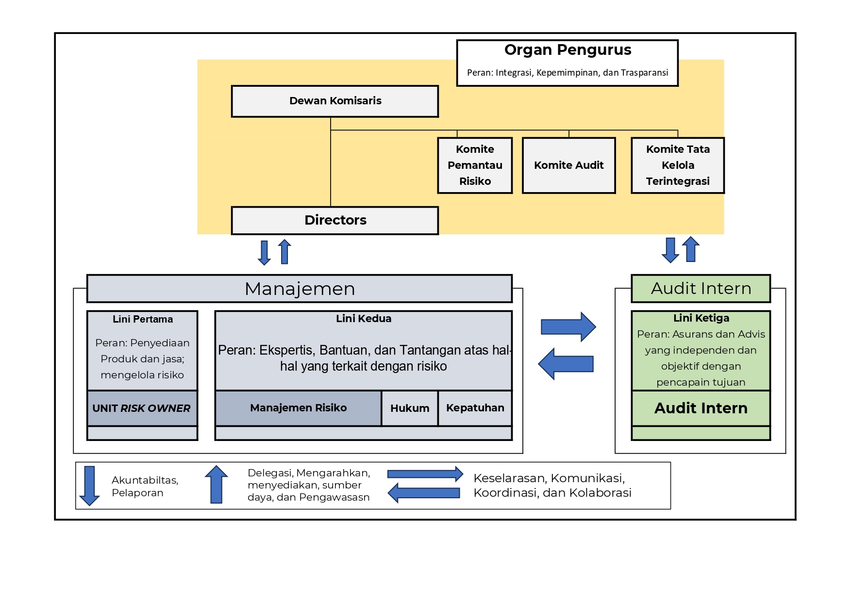Untuk menjalankan kerangka kerja tersebut secara efektif, Pupuk Kaltim telah menerapkan Model Tata Kelola Risiko Tiga Lini (Three Lines Model). Lini pertama adalah para pemilik risiko operasional di unit bisnis yang bertugas menjalankan pemenuhan kepatuhan. Lini kedua, yang terdiri dari Manajemen Risiko, Kepatuhan, Hukum, serta unit pendukung lainnya, berperan memastikan pemenuhan standar dan peraturan. Sebagai lini ketiga, Internal Audit bertugas memberikan jaminan independen untuk menguatkan efektivitas tata kelola dan manajemen risiko secara keseluruhan.