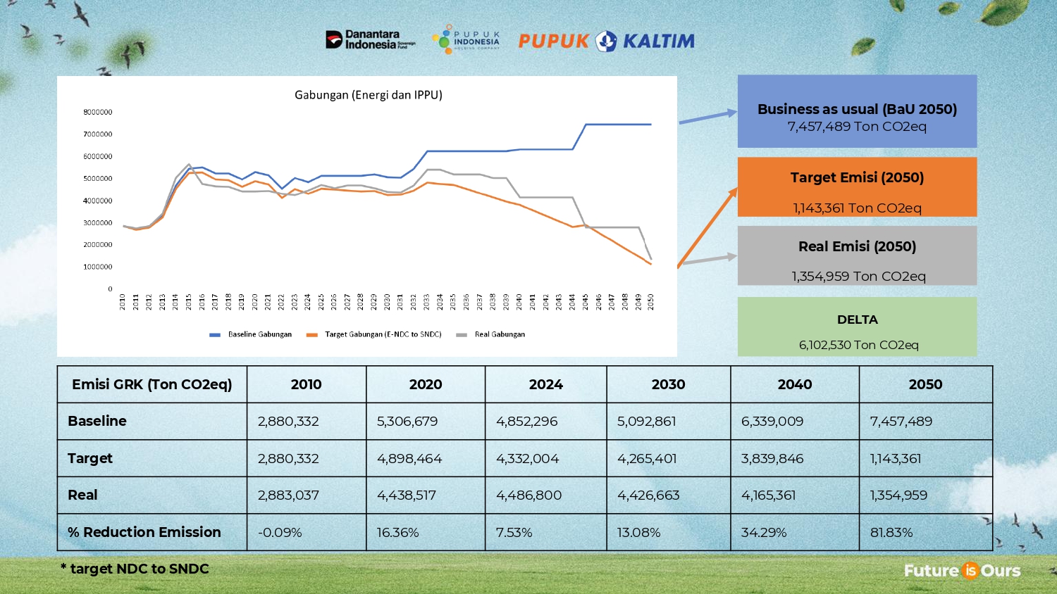 Dalam menetapkan target penurunan emisi, PKT menggunakan NDC dan SNDC Republik Indonesia sebagai acuan, dimana tidak dilakukan pengkategorisasian emisi berdasarkan scope seperti standar GHG Protocol, namun mengatur target emisi Indonesia berdasarkan sektornya yaitu IPPU, Energi (termasuk listrik, transportasi, industri), dan lainnya. Atas dasar itu, perhitungan target dilakukan dengan menggabungkan emisi Scope 1 dan Scope 2, sehingga menghasilkan gambaran yang lebih komprehensif terhadap total emisi operasional Pupuk Kaltim serta efektivitas strategi pengurangannya.